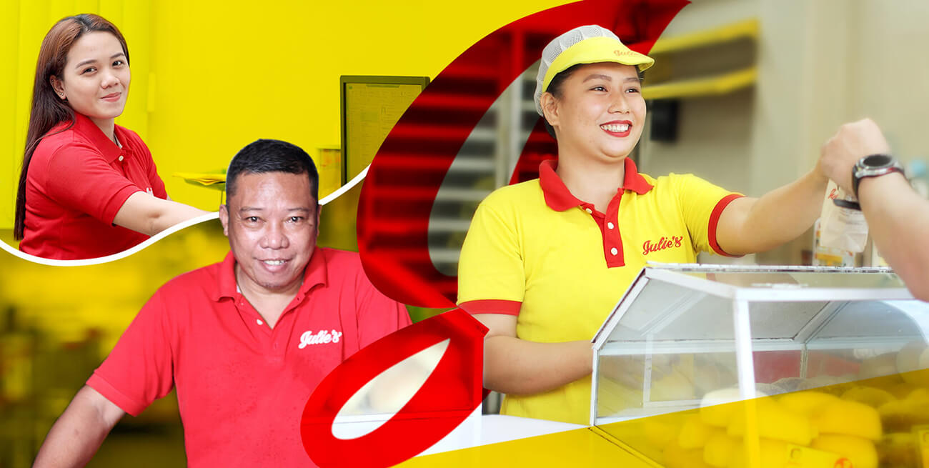 Admittedly not even a baking enthusiast, Ms. Julie took effort to learn hands-on all she needed to know about the baking industry and laid down her business concept: Fresh, steaming hot bread baked in full view of the customers and served with courteous greetings and warm smiles became the benchmark of Julie’s Bakeshop’s phenomenal success. 40 years later with more 450 stores and 100 franchisees nationwide, Julie’s is committed to its mission of feeding Filipinos by having a Julie’s bakeshop in every barangay.