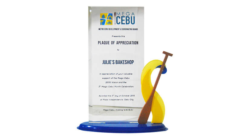 Julie’s Bakeshop received a plaque of appreciation from Metro Cebu Development & Coordinating Board for its support of the Mega Cebu 2050 Vision.
