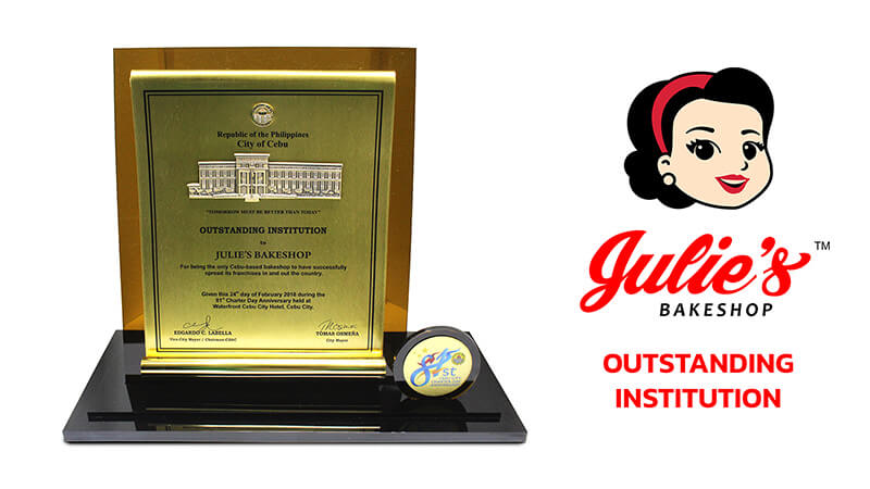 “Julie’s Bakeshop is awarded “Outstanding Institution” by the City of Cebu during it’s 81st Cebu City Charter Day Anniversary.”