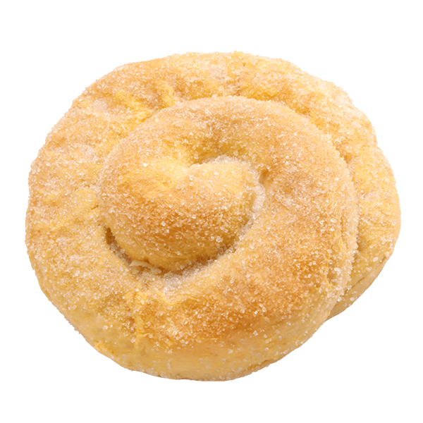 Twirl bread with rich golden brown crust and yellowish crumb with an intense butter note, and topped with sugar.