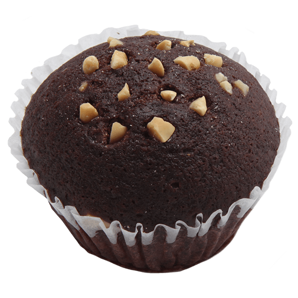 A very soft, sweet type flavored-chocolate cupcake topped with peanuts.