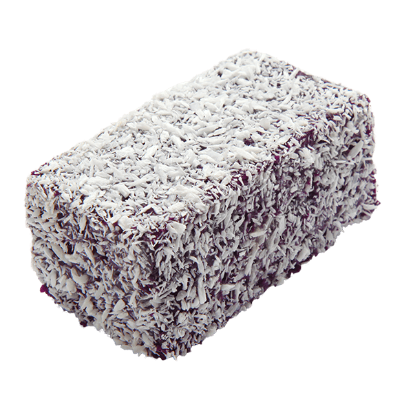 Soft, spongy cake with sweet, dairy ube coated with sugar and desiccated coconut.