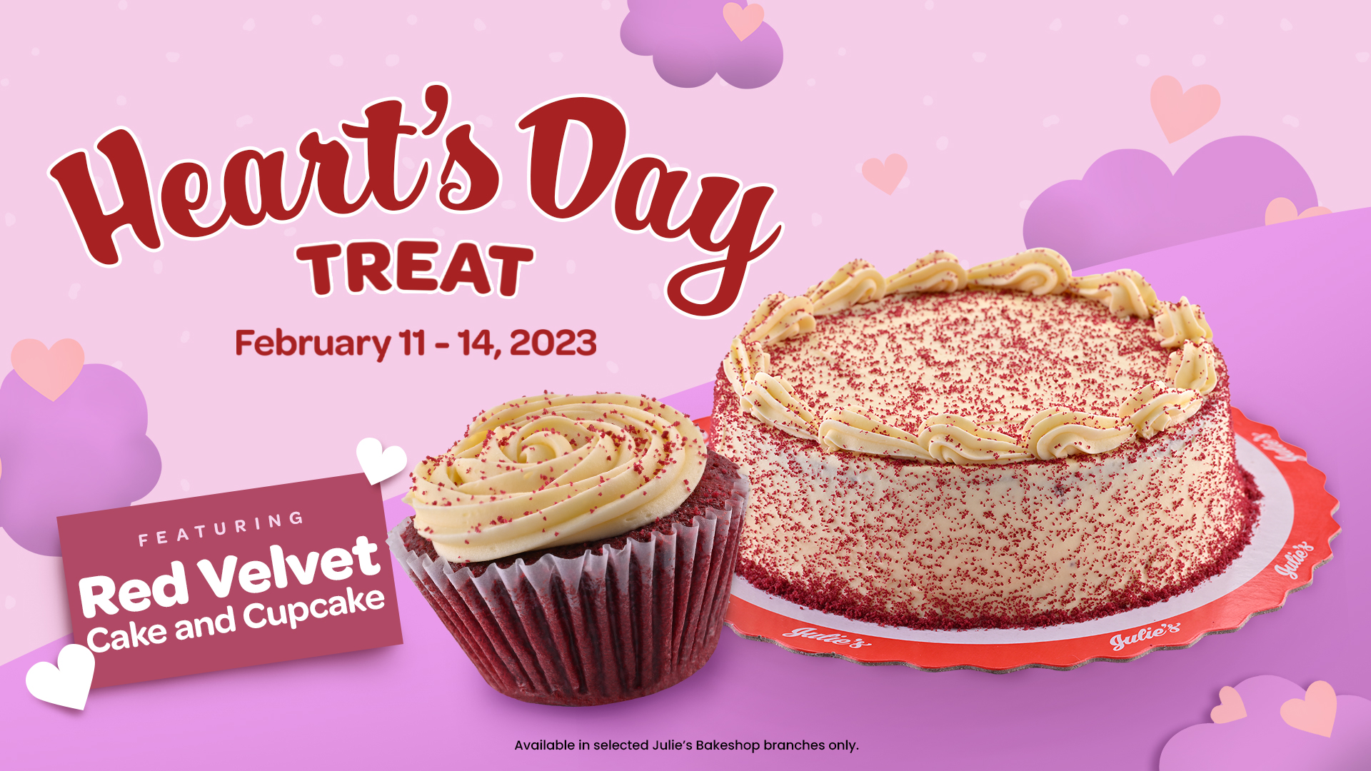 Looking for sweet treats for your sweetheart? This Valentine’s Day, surprise him or her with our newest Red Velvet Cake and Cupcake! Available on selected Julie’s Bakeshop branches from February 11-14, 2023 only!