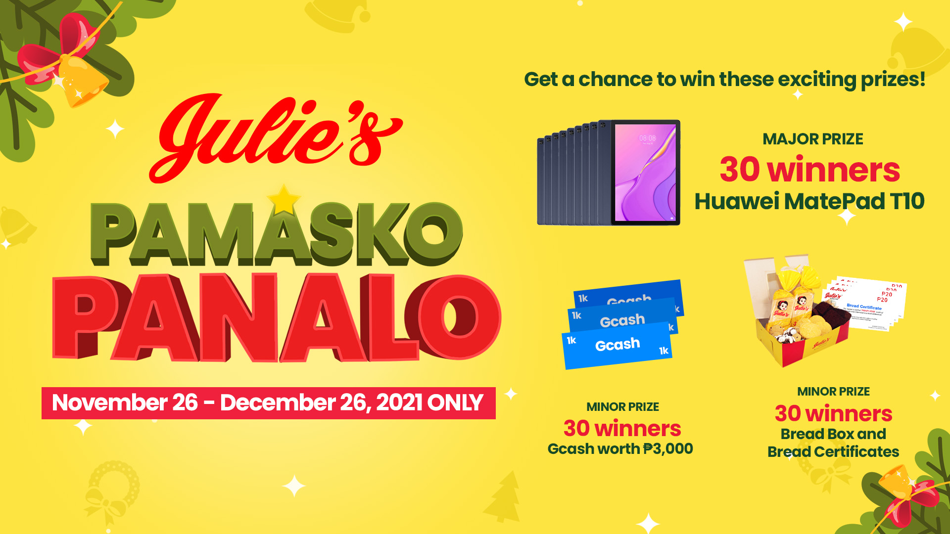 - Announcement of the e-raffle winners will be posted on the official Facebook page of Julie’s Bakeshop on December 28, 2021. All winners will be notified through the provided Mobile Numbers and Email Addresses.